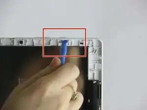 Нажмите на кнопку питания пальцем и одновременно подденьте в том же направлении пластиковым инструментом для вскрытия.