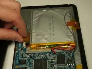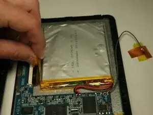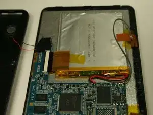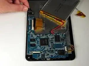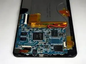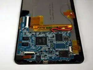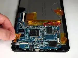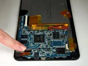 Поверните планшет на 180 градусов и приподнимите чёрный фиксатор разъёма, удерживающего маленький жёлтый ленточный кабель. Извлеките кабель из разъёма.