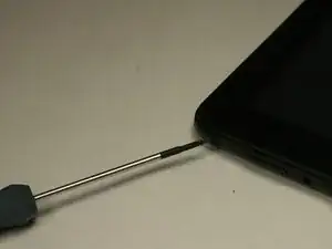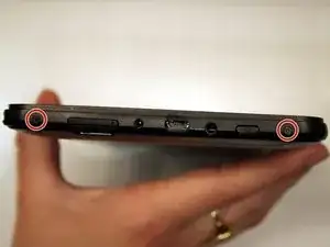 Открутите два (2) винта Phillips #00 длиной 1,3 мм, расположенные на нижнем торце планшета, где находятся кнопки питания и регулировки громкости.