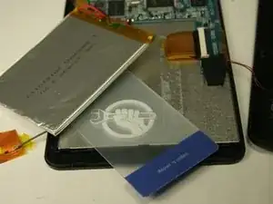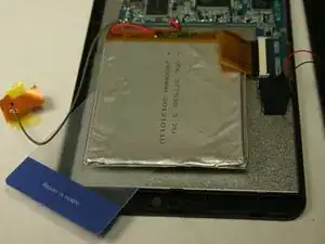 Используя пластиковую карту, аккуратно нарушите клей, который держит аккумулятор приклеенным к металлической панели экрана.