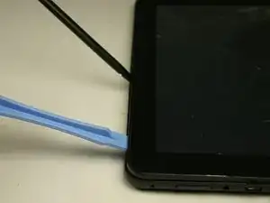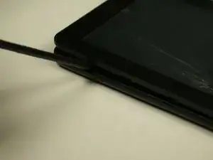 Вставьте пластиковый инструмент для вскрытия в зазор между панелью экрана и задней панелью, чтобы создать разделение между корпусами.