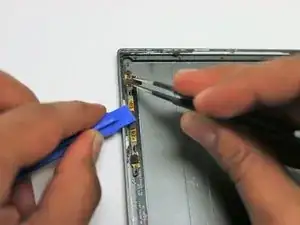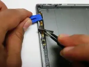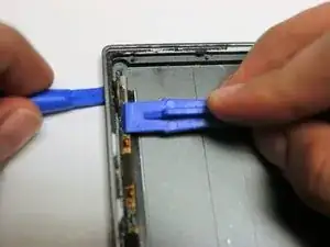 Удерживайте левую сторону планшета открытой с помощью пластиковой вскрывающей лопатки, чтобы иметь возможность извлечь кнопку громкости.