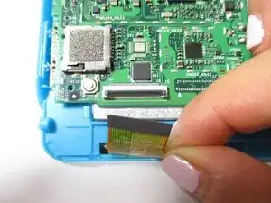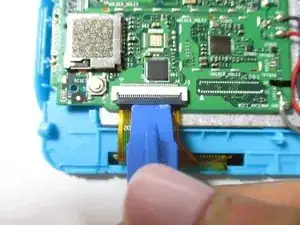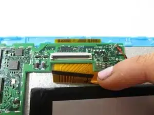 Извлеките оранжевый ленточный шлейф дисплея, расположенный над батареей, подняв рычажок разъёма ZIF пластиковым инструментом.