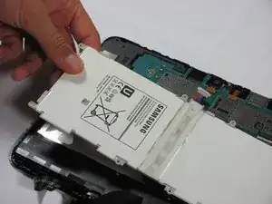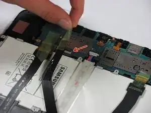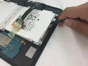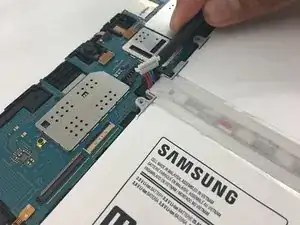 Если тянуть слишком сильно, можно повредить разъём на плате. Используйте лопатку или пинцет, чтобы прижать чёрный разъём на плате, одновременно аккуратно поддевая разъём батареи. Разъём очень легко ломается.