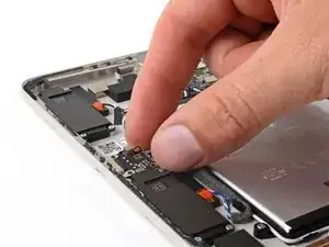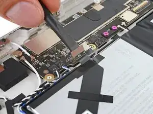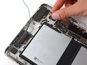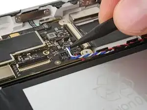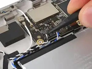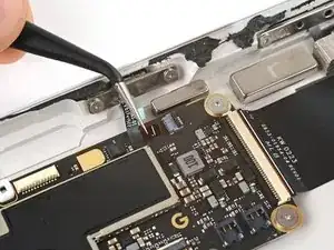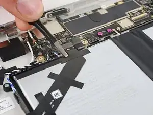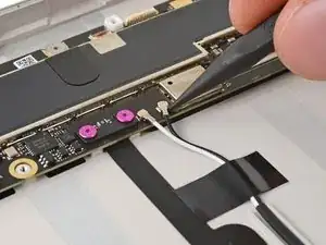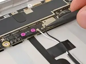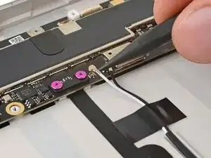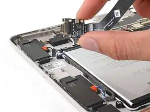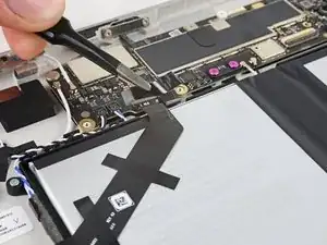 Используйте тупоносые пинцеты или пальцы, чтобы поднять и удалить три полоски скотча, удерживающие кабель порта USB-C к аккумулятору.