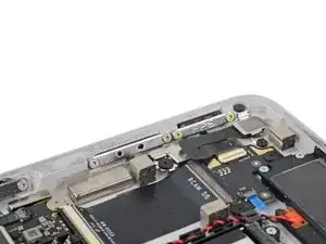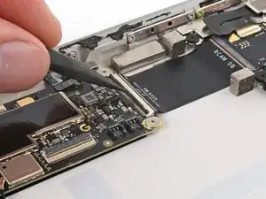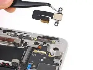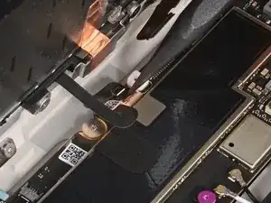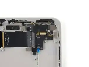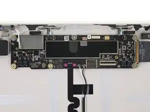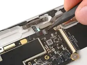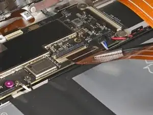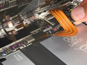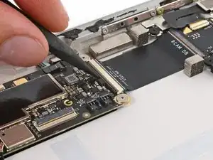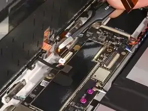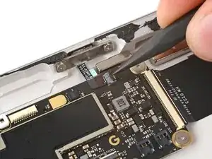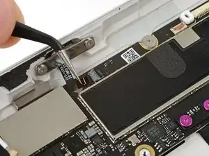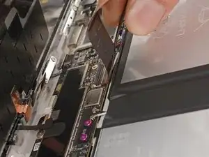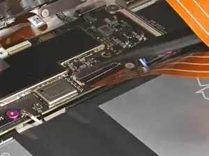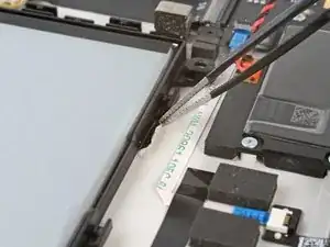 При сборке будьте осторожны, чтобы не порвать этот кабель, так как у него не так много места для изгиба. Направьте разъем в его гнездо с помощью пинцета и одновременно закройте фиксирующую планку разъема ZIF.