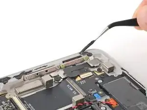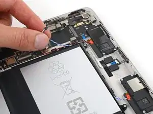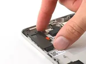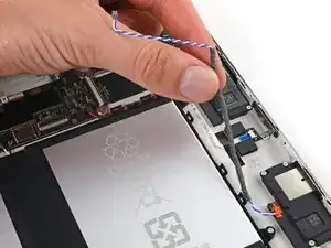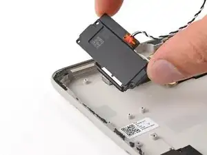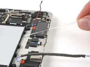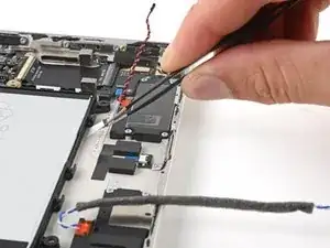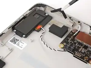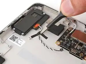 Используйте.forceps или ваши пальцы, чтобы отодвинуть и удалить ленту, удерживающую черный и белый кабели динамика на корпусе.