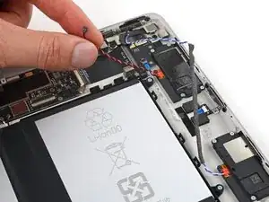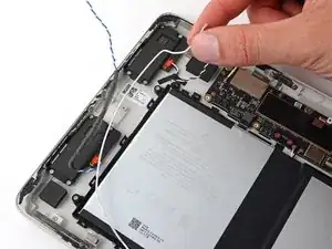 Вытяните кабели динамиков синих и белых из их зажимов вдоль верхнего и правого края отсеков для аккумуляторов.