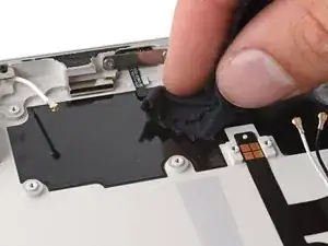 Отключите левый соединитель антенны от материнской платы, поддёрнув металлическую основу кабеля прямо вверх.