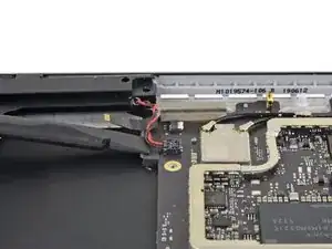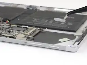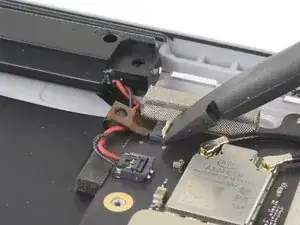 Снимите пинцетом серебристую ленту, фиксирующую правый кабель дисплея к материнской плате.