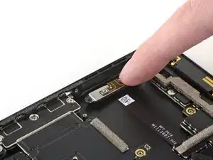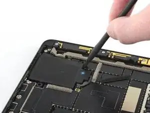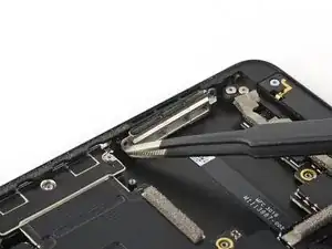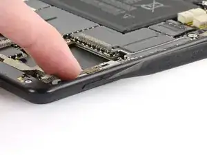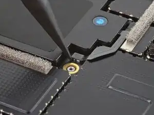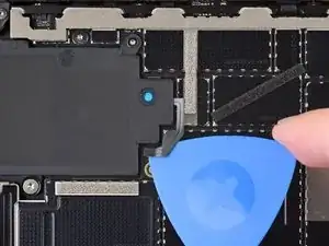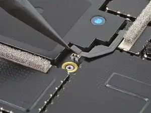 Вставьте конец пинцета под нижний правый угол щита кабеля дисплея (где кабель дисплея направлен вниз).