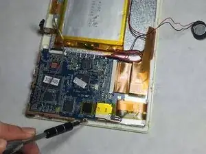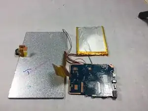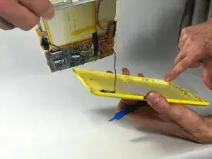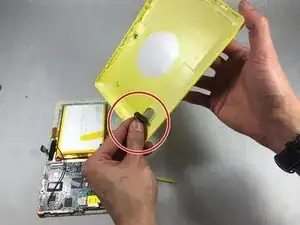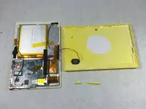 Это должно открыть внутренности планшета, будьте осторожны, так как кнопки громкости и питания могут выпасть в процессе. Динамик также будет соединен с корпусом проводами, как показано.