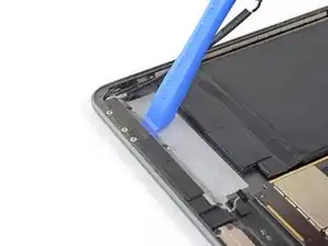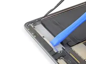 Используйте медиатор, чтобы разрезать клей под верхним краем iPad, проведя его к верхнему правому углу.