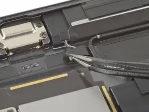 Используйте пинцет, чтобы снять ленту, покрывающую винты левого динамика.