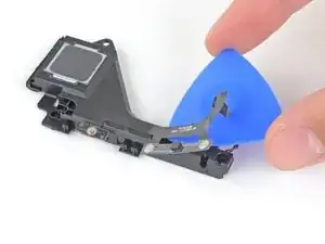 Осторожно подденьте инструментом для вскрытия под кнопку питания и отделите её от левого динамика.