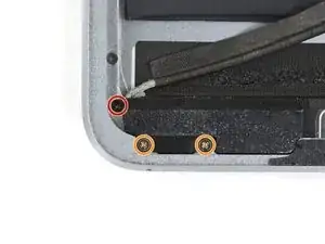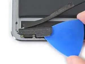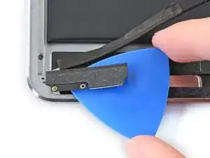 Используйте пинцет, чтобы поднять небольшой ярлык рядом с нижним правым динамиком, который фиксирует кабель левой антенны к рамке.