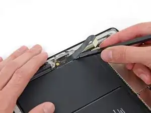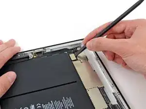 Антенна крепится к нижней части iPad винтами и кабелем. Этот шаг отделяет антенну от передней панели, гарантируя, что при снятии панели антенна не будет повреждена.