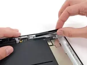 Вам потребуется освободить клей, фиксирующий антенну к передней панели, не повредив хрупкие элементы, соединяющие антенну с нижней частью iPad. Тщательно следуйте следующим шагам.