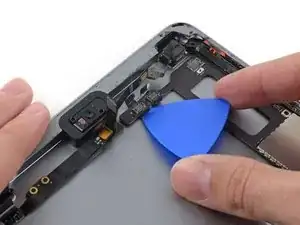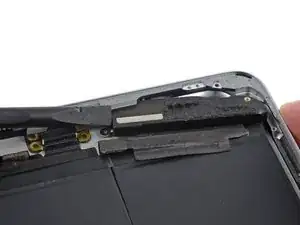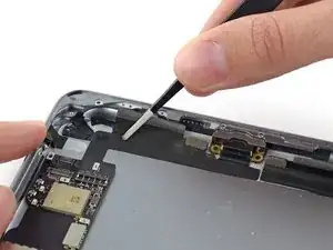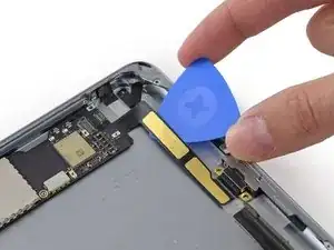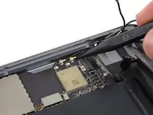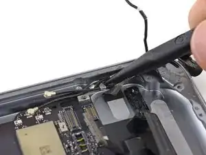 Воспользуйтесь кончиком лопатки, чтобы поддеть полоску ленты кабеля антенны от задней панели iPad.