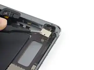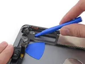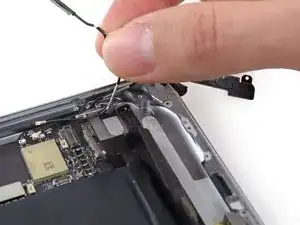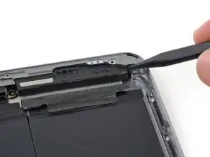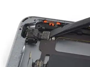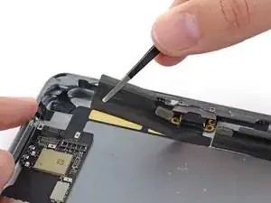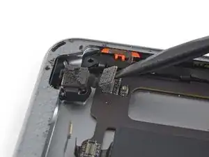 Воспользуйтесь плоским концом лопатки, чтобы ослабить пенополиуретановый клей, удерживающий антенну Wi-Fi рядом с левым динамиком.