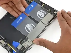 Если клей, крепящий плату логики, слишком сильно сопротивляется, повторно нагрейте iOpener и положите его на заднюю панель, чтобы смягчить клей.