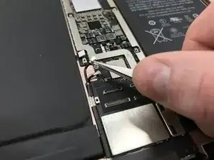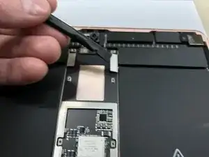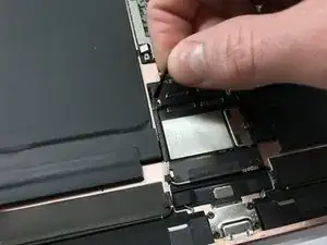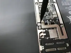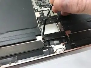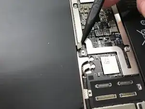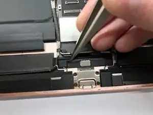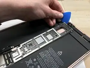 Обратите внимание, что в разъёме аккумулятора используются консольные пружины на логической плате, прижимающиеся к контактным площадкам аккумулятора. Поскольку и логическая плата, и аккумулятор приклеены, потребуется вставить тонкий и гибкий инструмент между контактами, чтобы отключить аккумулятор.