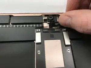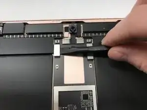 Сразу по центру верхнего края iPad находится фронтальная камера, которая может быть повреждена, если разборку вставить слишком глубоко. Работайте только кончиком разборки при прорезании клея вблизи камеры.