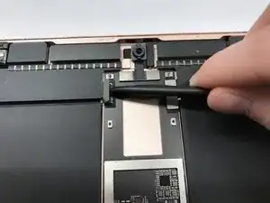 Используйте лопатку, чтобы отключить два видимых гибких кабеля дисплея, аккуратно поддев их вверх, перпендикулярно разъёмам.