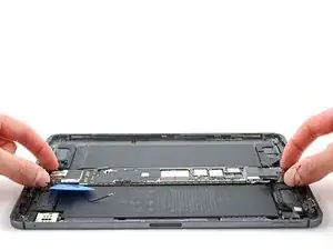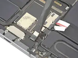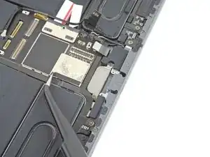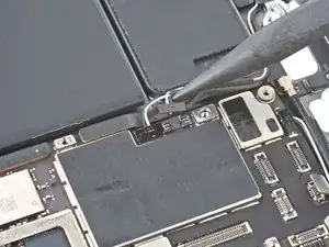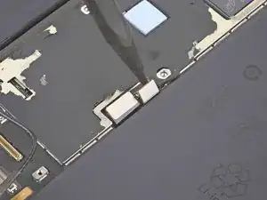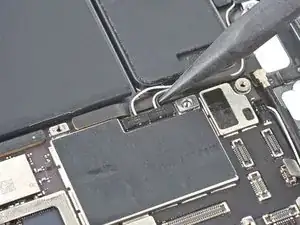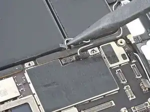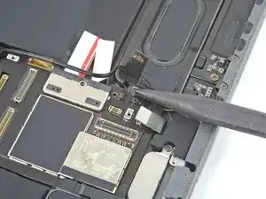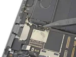 Пинцетом отогните ленту, крепящую кронштейн кабеля левого нижнего динамика к плате логики.
