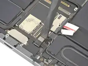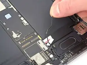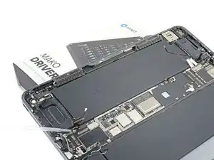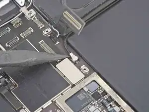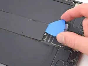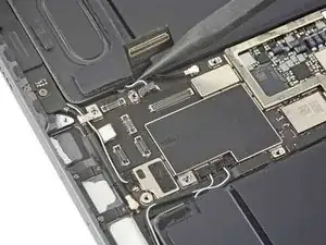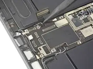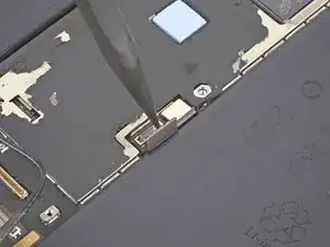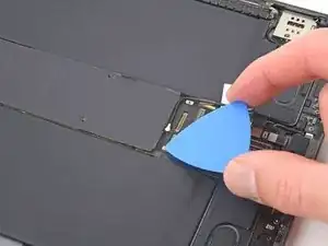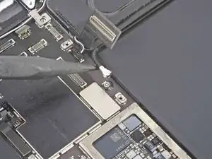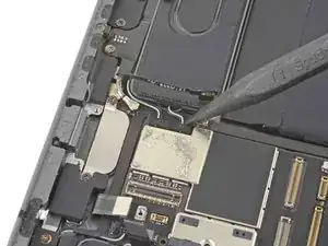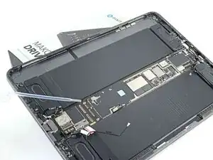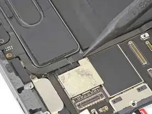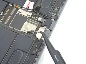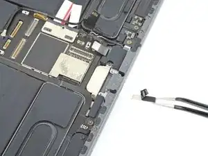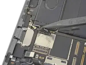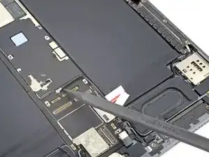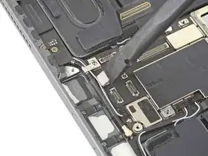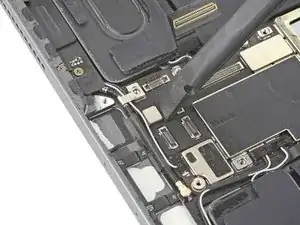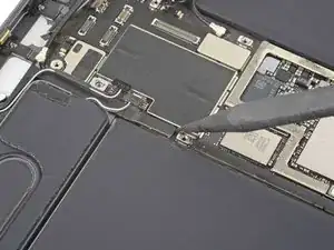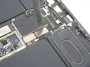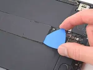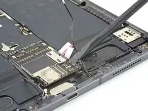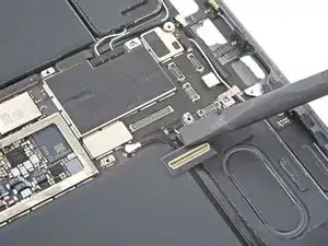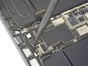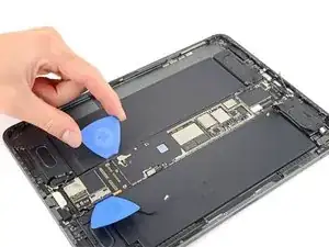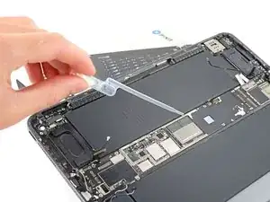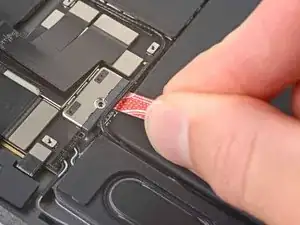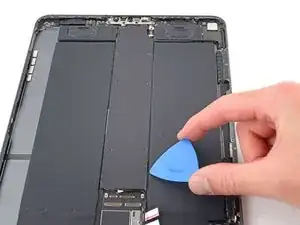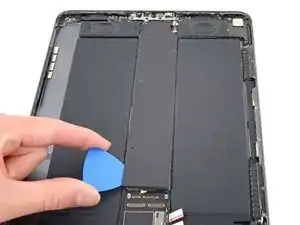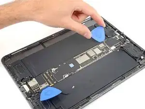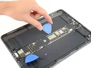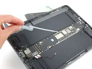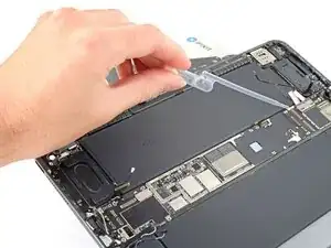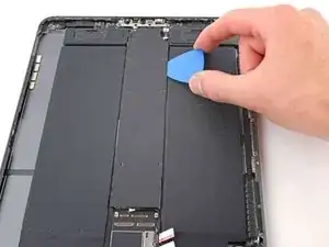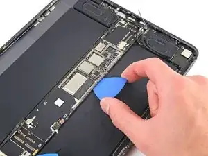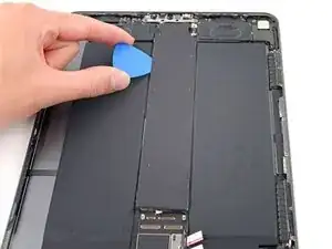 Вставьте медиатор под правый край платы логики над кабелями левого микрофона и зарядного устройства Apple Pencil.
