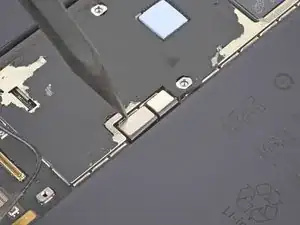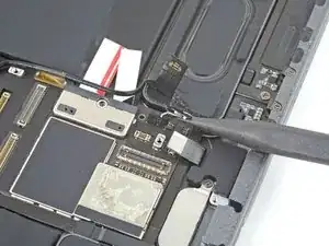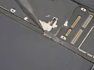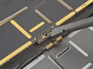Используйте заострённый конец лопатки, чтобы отсоединить кабели левого микрофона и зарядного устройства Apple Pencil.