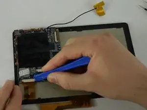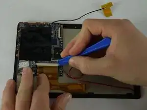 Используйте пластиковый инструмент для вскрытия, чтобы вытащить чёрные фиксаторы по обеим сторонам разъёма шлейфового кабеля.