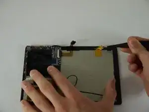 С помощью пластикового инструмента для вскрытия аккуратно подденьте корпус устройства. Продвигайтесь по всему периметру корпуса и осторожно разместите обе панели рядом друг с другом.