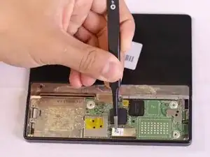 Используя металлическую лопатку, пинцет и кончики пальцев, аккуратно поднимите оранжевый разъём питания с материнской платы, а затем — с Kindle.