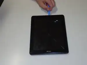С планшетом, обращенным к вам, откройте его. Начните с левого угла (возле кнопок), двигаясь по часовой стрелке, пока планшет не откроется, используя либо набор лопатков, либо пластиковый инструмент для открывания.