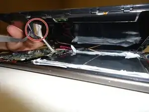 Теперь удалите серебристый кабель, убрав ленту, соединяющую кабель и экран, а затем осторожно отсоедините золотой кабель от разъема.
