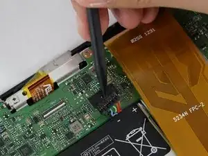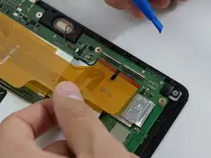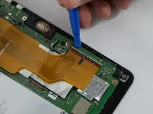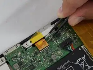 Отключите разъём подключения ЖК-дисплея, аккуратно удалив чёрную защитную полоску с помощью пинцета, а затем потяните за оранжевый шлейф.