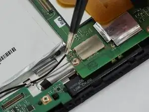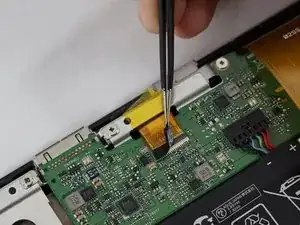 С помощью пинцета аккуратно потяните за маленький чёрный кабель, подключённый к материнской плате, чтобы отсоединить его.