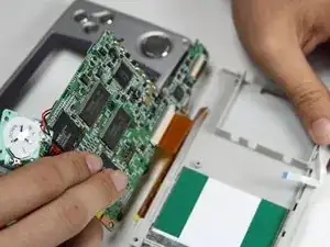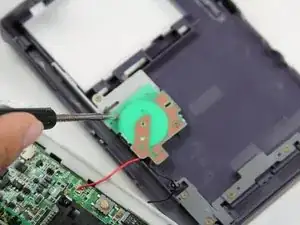 Используйте крестовую отвёртку Phillips #00, чтобы выкрутить два винта с зелёной печатной платы на задней части корпуса.