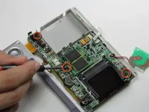 Снимите три винта на материнской плате, показанные на изображении, используя крестовую отвёртку Phillips #00.