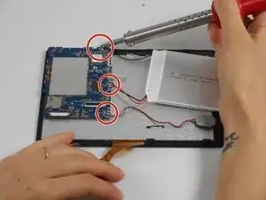 Приложите паяльное жало к трём контактным точкам, чтобы отсоединить материнскую плату от батареи. Советы по пайке и выпайке смотрите в этом руководстве.