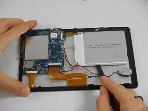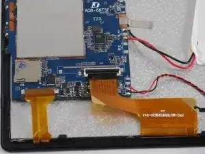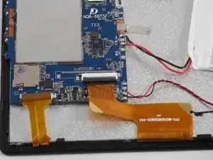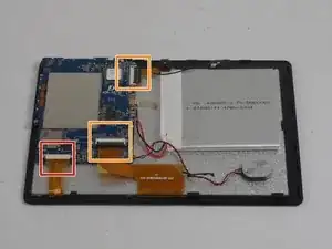 Кабель, отмеченный красным, зафиксирован двумя тёмными фиксаторами; оттяните каждый от кремового разъёма в направлении края планшета. После открытия фиксаторов аккуратно извлеките кабель.