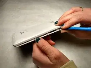 Вставьте пластиковую лопатку между задней панелью и экраном и начните поднимать заднюю крышку.