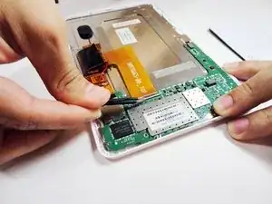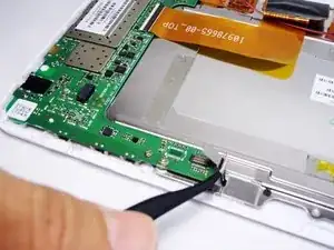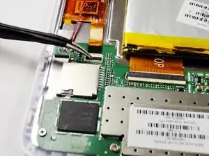 Удалите меньший шлейф, аккуратно подняв черную защелку и вытянув её с помощью пинцета.