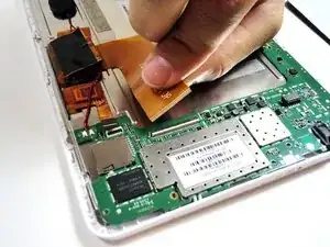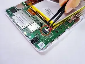 Удалите более крупный шлейф, аккуратно подняв бежевую защелку и вытянув её с помощью пинцета.