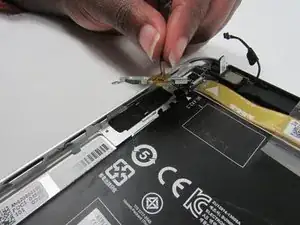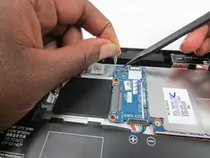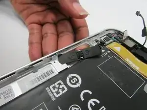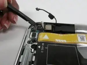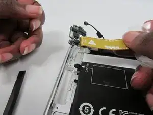 Поднимите ленточный кабель платы кнопки питания вверх и в сторону, чтобы он не мешал при снятии аккумулятора.