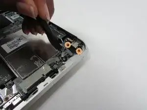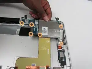 Удалите винт Phillips PM 1.3×2.0 мм с широким потайным шляпкой и винт Phillips PM 1.3×2.0 мм, которые фиксируют плату кнопки питания к нижней крышке.
