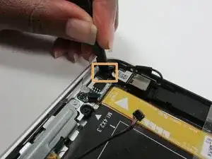 Вставьте пластиковую медиатор между дисплеем и корпусом планшета. Затем используйте пластиковый инструмент для съёма, чтобы дальше разъединить дисплей.