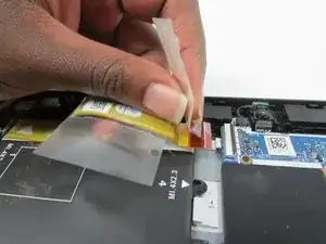 Отключите разъём аккумулятора от системной платы, осторожно надавив на него пластиковой монтажной лопаткой, затем оттяните его от системной платы.