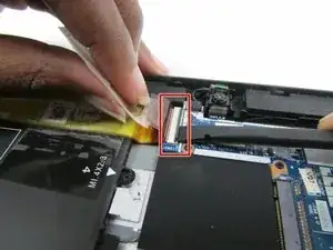 Разблокируйте разъём ZIF, к которому подключён кабель дисплея, затем отсоедините кабель дисплея от материнской платы.